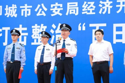 为有效震慑违法犯罪,回应人民群众新期待,展示聊城开发区公安严厉打击各类违法犯罪活动的决心和丰硕战果,8月20日上午,聊城市公安局经济开发区分局在聊城开发区市民服务中心广场举办夏季治安打击整治“百日行动”退赃大会。聊城市公安局党委委员、副局长李鹏,聊城经济开发区党工委副书记、管委会副主任赵鹏,聊城市公安局刑侦支队支队长李宏伟,治安支队支队长张震等市局相关部门负责同志,聊城市公安局经济开发区分局党委副书记、政委李文昌及领导班子成员,九州、蒋官屯街道办工作人员、受害群众代表及民警辅警200余人参加活动,活动由李文昌同志主持。