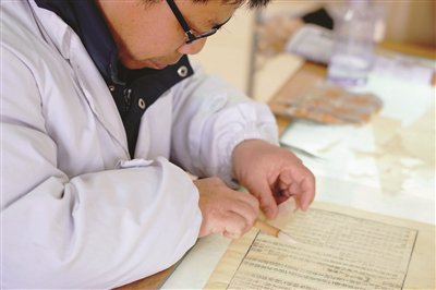 吴庭宏用毛笔蘸过事先调好的稀浆,轻涂在书页上,然后敷上一层宣纸,再用镊子将毛边挑干净。“修古书一定要细致入微,任何一点失误都可能给古籍造成致命的伤害。”吴老师说。