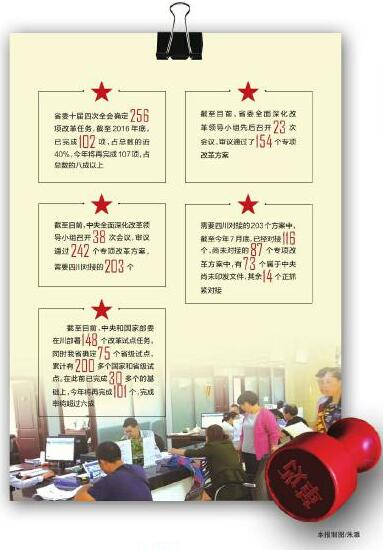 党的十八届三中全会吹响了全面深化改革的冲锋号。四川贯彻落实中央改革部署,实施多项重大改革,在重要领域和关键环节取得突破,政府职能转变效能提高,社会服务体系重构,干群关系改善,城乡面貌在发生深刻变化,让全川各个层面的人们都分享到改革和社会发展的红利。
