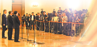 上午7时30分,“党代表通道”采访开始。第一个接受采访的是三上太空的中国人民解放军航天员大队航天员景海鹏代表。“执行过神舟七号、神舟九号、神舟十一号三次飞行任务,但是以党代表身份和各位见面还是第一次。我一定认真履行好党代表的职责,充分发挥好党代表的作用。”景海鹏意气风发地说。