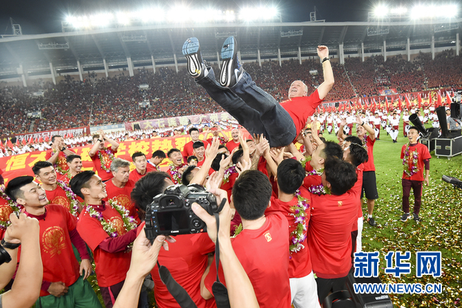 新华社广州10月22日电(记者李旭)22日晚,广州天河体育中心。广州恒大队主场战胜贵州恒丰队,提前两轮夺取2017赛季中超足球联赛冠军。这是恒大俱乐部自2011年晋级中超联赛7年来连续获得的第七个冠军。