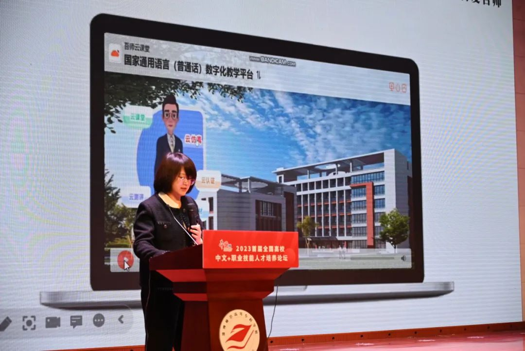 吾爱吾师教育研究院副院长朱捷音以中文+职业技能数字化实训基地四位一体建设探索与创新为主题作发言。她从研究背景、创新成果、实训室建设和教学服务等四个方面进行阐述。她表示,为更好地推进教育数字化转型,需用好智慧教育平台推动普通话教学、幼儿教师口语教学、职业培训师教学、职业技能大赛、国际办学相互融通。