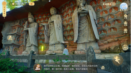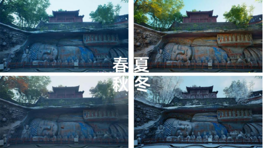 在“云游·大足石刻”元宇宙景区里游览,动动手指就可以让景区从阳光明媚的春天瞬间变化为银装素裹的深冬。“云游·大足石刻”运用了许多“黑科技”,毫米级精准建模、深度复原实景、8K超高精度画质,加上完美融合用户视角、光照方向、光照强度、光照环境等因素的实时光线追踪系统,带来身临其境般的逼真视觉效果。尤其是在实时天气系统的加持下,数字空间与物理世界完美衔接映射,游客仿佛一秒穿越时空的长河,不仅可以感受当季当时的石刻风光,也可自由切换季节与天气,在春光明媚、夏阳高照、秋高气爽、冬雪皑皑等天气中漫步景区,在一场旅途中领略四季不同的大足石刻之美。