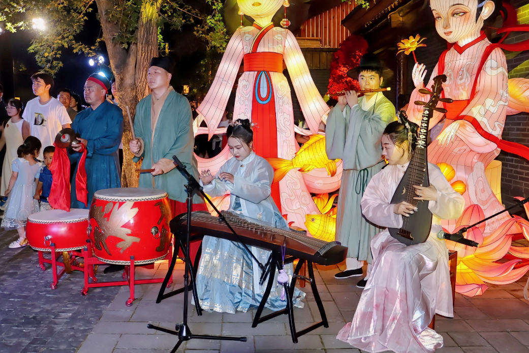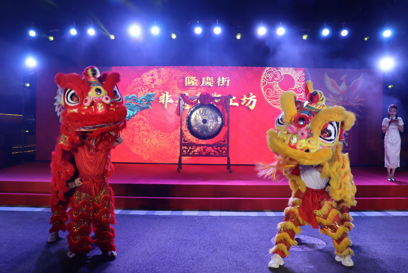 开街当晚,精彩节目轮番登场。舞狮表演威风凛凛,汉服互动巡游带领游客沉浸式感受大明风貌,活力四射的NPC舞蹈表演吸引众多游客拍照打卡。以开街为主题的无人机表演更是惊艳全场,变幻万千的灯光中,“凝香斋”“酥怡轩”“灵偶轩”等非遗工坊的主题图形在夜空中闪耀,勾起游客浓厚兴趣。