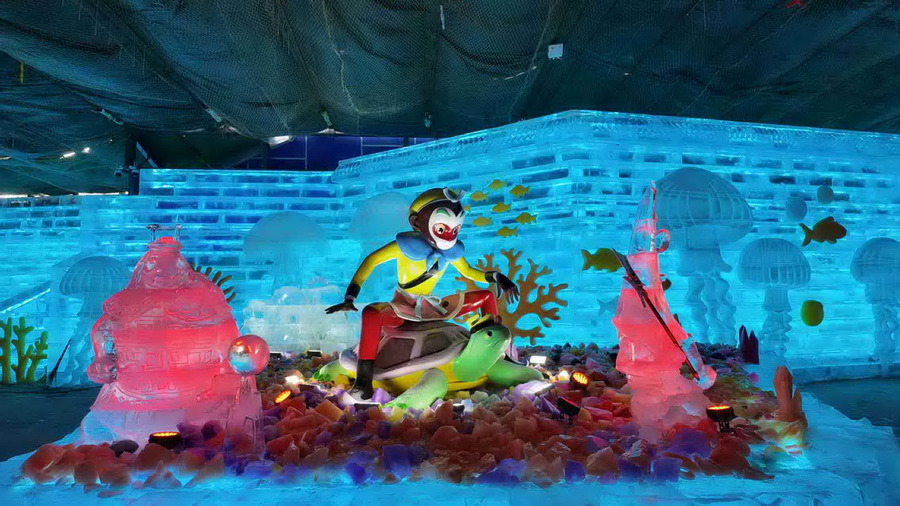 北京世园国际旅游度假区、龙庆峡景区携手上影元致敬上海美术电影制片厂经典动画作品《大闹天宫》,通过花灯、冰灯的形式,共同呈现《大闹天宫》这一国潮动画内容。世园花灯深耕“蟠桃园-灵霄殿”天庭叙事线,龙庆峡冰灯则聚焦“龙宫借宝”水下剧情,形成故事线上的呼应串联。