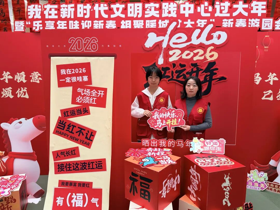 打卡快闪区布置了精美的新春背景板,摄影志愿者辅助拍照,定格美好瞬间;美食分享区里,茶歇甜点整齐摆放,最受欢迎的当属棉花糖制作角——志愿者们手法娴熟地转动机器,雪白蓬松的棉花糖裹着彩糖粒,刚做好就飘来甜甜的香气,引得小朋友们大排长龙。