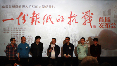 中国首部以“报人抗战”为题材的大型纪录片《一份报纸的抗战》25日在京举行首播发布会。这部纪录片共分六集,以大公报参与、推动抗战为线索,讲述了一份报纸在国家危难之际的特殊贡献与担当。大公报总编辑贾西平表示,“百余年来大公报一直是历史的忠实记录者,这部纪录片将分布在全国各处的珍贵史料变成了如此光彩照人的影像资料,不仅值得年轻人学习,也值得各阶层观众去体味。”大公报著名记者萧乾夫人文洁若、大公报原总经理胡政之孙女胡玫、大公报创办人英敛之曾孙英达、大公报著名记者吕德润之女吕安妮等出席发布会。