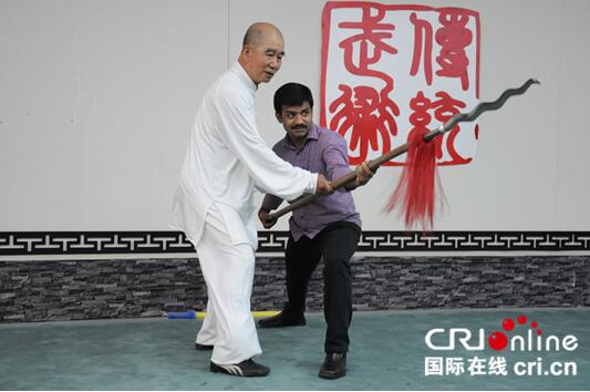 国际在线河北频道消息(王珊珊 实习生 李晓霞):5月9日,“漂洋过海来看你,唱响河北好声音·助力廊坊国际经济贸易洽谈会 2017CRI中外记者美丽河北行”采访团走进沧州,一段精彩的武术表演拉开了沧州采访行程的序幕。外籍记者在台下看的热闹,纷纷用镜头记录下精彩的一刻,更有外籍记者直接上台和武术老师讨教起来。