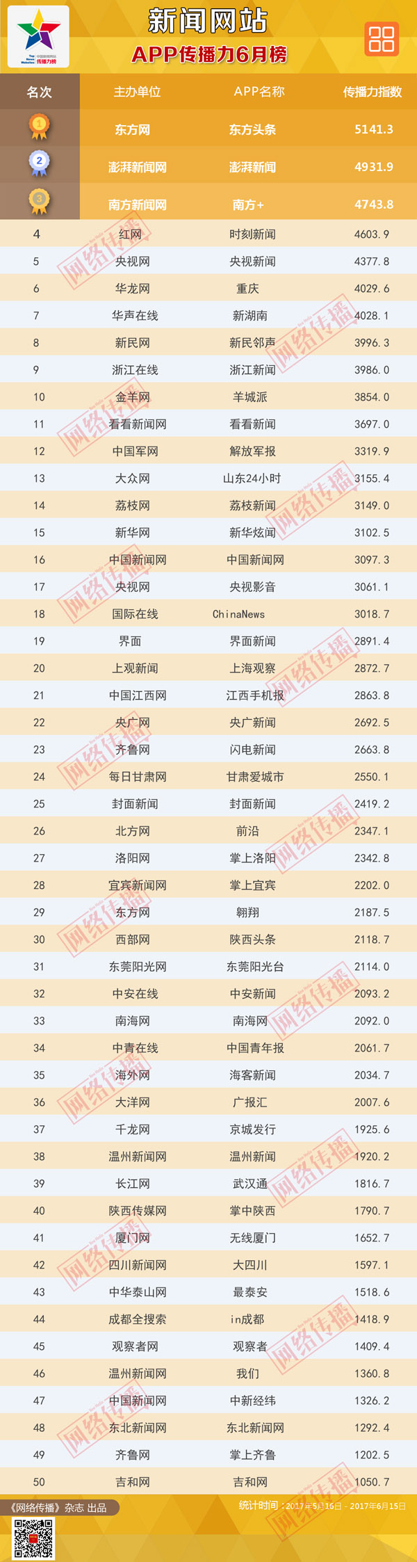 中央网信办《网络传播》杂志倾力打造的“中国新闻网站App排行榜2017年6月榜”今日发布。
