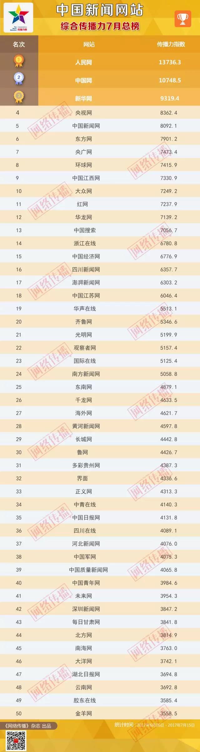 中央网信办《网络传播》杂志倾力打造的“中国新闻网站传播力2017年7月总榜”今日发布。
