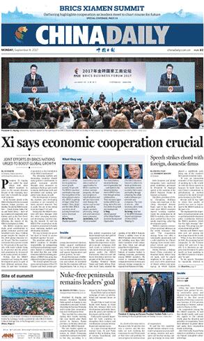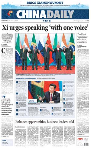 中国日报9月3日电(记者 陈柳兵 张陨璧 贺炜 胡雨濛) 2017年9月3日至5日,金砖国家领导人第九次会晤在福建厦门举行。在厦门会场,中国日报金砖峰会官方会刊深受各界好评。