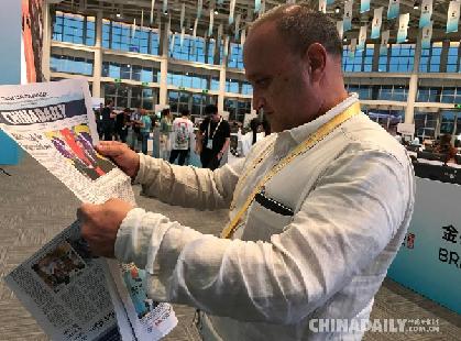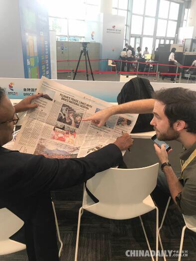 墨西哥官方电视台Cepropie记者阿尔法罗·瓦列霍·马里奥·罗伯托(Alfaro Vallejos Mario Roberto)表示,自己很喜欢看《中国日报》,这次参会,他在酒店就阅读了会刊,了解了很多关于会晤的信息,包括志愿服务、金砖会晤的准备情况等,让他体会到中国组织此次会晤的水平之高。