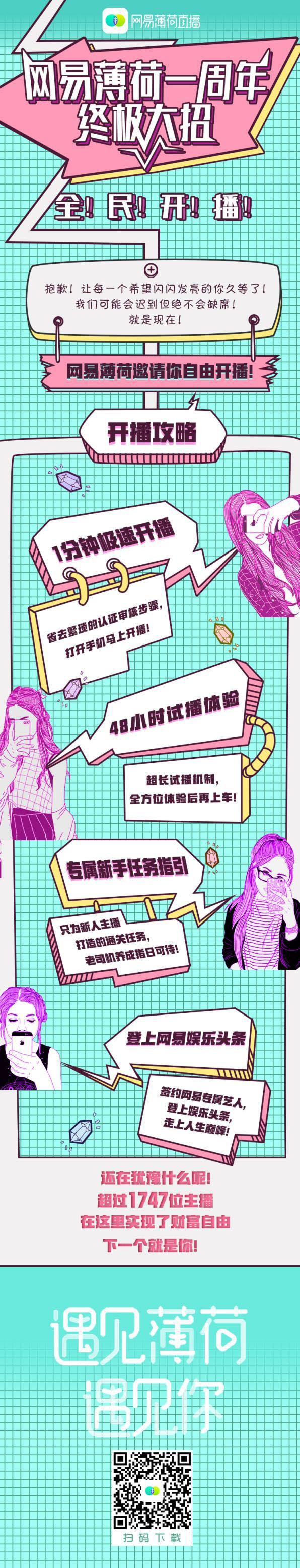 一年时间,网易薄荷直播的差异化内容运营策略成果显著。凭借网易传媒旗下娱乐、时尚、音乐、游戏等多渠道内容资源整合优势,网易薄荷直播不仅为平台上的主播打造出一条专业快速上升通道,也为用户带了更立体化的泛娱乐消费体验。截至目前平台主播直播时长累计达167万个小时,帮助1747位追梦男女实现了财务自由。