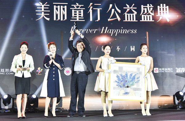 晚宴现场拍卖环节中,邀请到了国家金牌公益拍卖师、北京保利国际拍卖有限公司拍卖师唐花玲女士担任拍卖师,其中饰品《彻夜流香》、刺绣作品《丹碧翠屏》、油画《窗前》等珍贵艺术品及收藏品均以高价拍出。在拍卖过程中,马丽、尚雯婕、阚清子、Mike Angelo、何泓姗、范湉湉等爱心明星作为助拍嘉宾依次登台,为慈善募捐助力,并获得凤凰网“美丽童行”爱心大使荣誉称号。