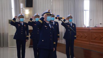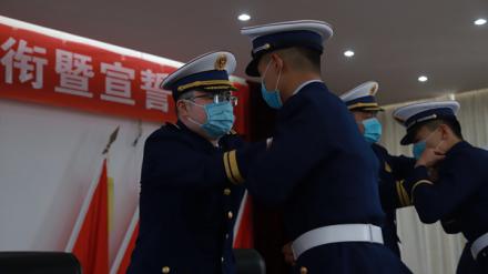 仪式伴随着庄严的《中国人民共和国国歌》拉开帷幕。范永利同志宣读了授衔命令;与会领导为队员代表佩戴消防救援衔;新训消防员代表作了表态发言;随后,在领誓人的带领下,全体新消防员举起右拳,在队旗前进行了庄严宣誓。