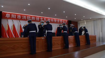 4月29日上午,安徽省阜阳市消防救援支队隆重举行首批招录消防员授衔仪式。支队机关全体指战员、首批招录消防员及组训队员、各大队一名主官参加仪式。