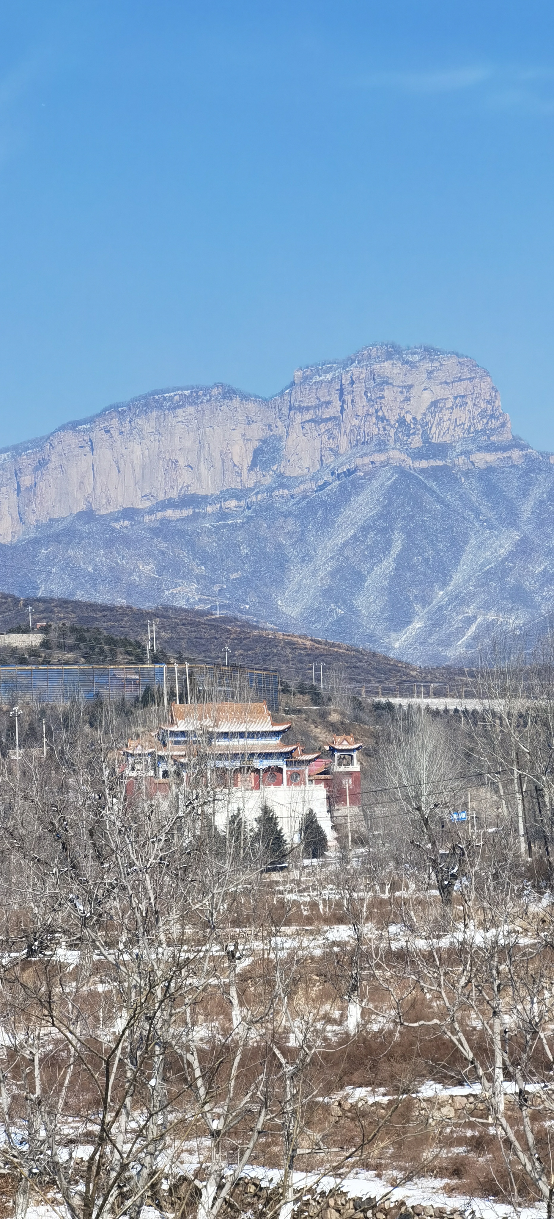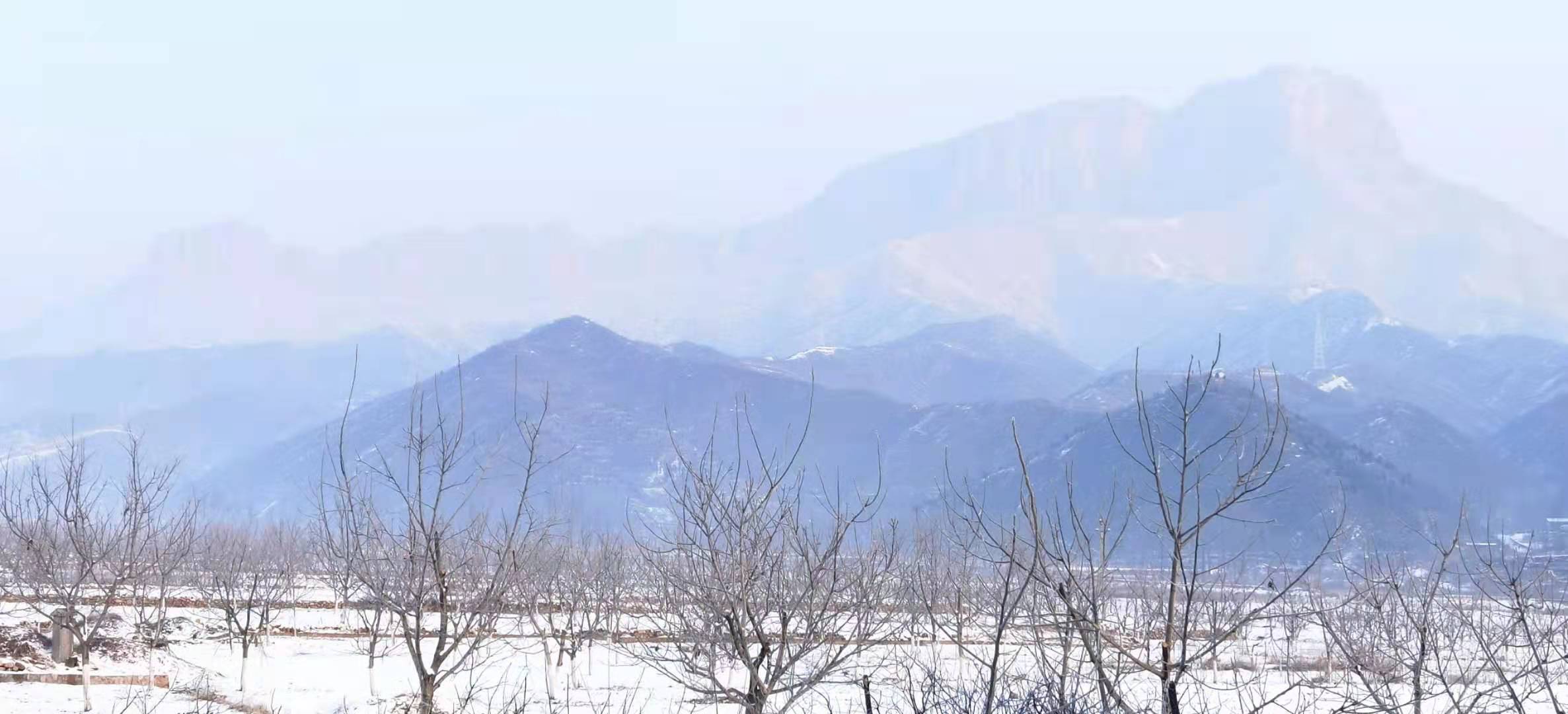 路过小镇北端滩里村口的“八骏图”照壁,稍向南百十米就来到去年夏天刚修好的“太行1号莲花步道”,红色的步道早消失不见,呈现在眼前的是漫长的白色“雪道”和因为冬季而“一眼望穿”的核桃林,“雪道”和核桃林的远处就是高耸入云的毛公山。