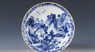 Introduction: This cup has a slightly flared rim, bulging belly and round foot. The bottom is glazed in white without a mark and the edge of the rim is colored with brown glaze. The shallow saucer has an open mouth and round foot, with white glaze on the base carrying no marks. The rim of the saucer is edged in brown glaze. The cup and saucer are decorated with blue and white landscape designs. The rims of the interior walls of both the cup and saucer are also decorated with blue and white flower patterns, while the exteriors are embellished with landscape patterns. This cup and saucer set features exquisite paintings with distinct light and shade. The design depicts friends meeting to play musical instruments, with mountains, pavilions, fishing boats and egrets in the blue sky in the distance. It offers a vivid depiction of the landscape of eastern China with a broad horizon and profound connotations. Landscape painting is the quintessence of the Chinese culture and philosophy, which delivers the Confucianism and Taoism traditions. Although the designs are small in size, they express a mindset of detachment and a preference for natural scenery, which reflects the eternal harmonious relationship between humans, nature and the universe.
