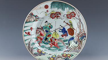 Introduction: This plate features the famille-rose technique, which was created in the late Kangxi period (1662-1722). The technique was based on the production of Kangxi enameled porcelain and developed an overglaze decoration that is fired at low temperatures by the Imperial Kiln Manufactory. The main feature of famille-rose porcelain is the innovative use of glossy white on the porcelain before applying other colors, which produces the effect of ink painting and shows the variation of space. This highly demanding technique can make paintings appear soft and elegant in color. So it is also called “gentle hue decoration”. During the Yongzheng period, the famille-rose porcelain technique of official and private kilns both became fully fledged with distinctive features began to emerge. This plate is a superb example of famille-rose porcelain produced in a private kiln in Jingdezhen during the Yongzheng period. The design depicts the scene of a person who has passed the imperial examination to become an official returning joyfully to his hometown. It conveys good wishes of the ancient Chinese people at that time. And to this day, it still transforms the expectation for improving their lives through learning and hardworking.