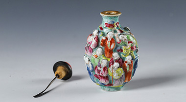 Introduction: Snuff bottles were popularized during the Qianlong Reign of the Qing Dynasty. Snuff-taking was said to be quite refreshing and became a common habit among literati and merchants in the Qing Dynasty. The popularity of snuff boosted the production of snuff bottles during this period. Snuff bottles can be made from a variety of materials, but those with porcelain bodies were the most popular. This famille-rose snuff bottle is decorated with the 18 Arhats of Buddhism. The painting vividly depicts the distinctive facial expressions and postures of the Arhats with delicate stokes and famille-rose colors, making this snuff bottle an excellent example of porcelain ornaments in the late Qing period. In short, this snuff bottle is a miniature masterpiece that represents many features from that period.