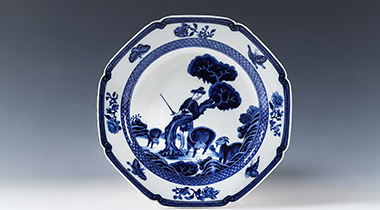 Introduction: This blue and white plate was made in Jingdezhen for export during the Qianlong period and features an elegant and graceful style. The plate is octagonal in shape, with a folded rim that is decorated with an orderly composition of butterflies and flowers on cut stems in underglaze blue. The detailed depiction of the subjects showcases the superb skills of the craftsmen of the Jingdezhen kilns and the high level of development of the ceramic manufacturing industry in Jingdezhen during this period. The design in the center of the plate, featuring a shepherdess, is an excellent example of the blending of the traditional Chinese painting style, which focuses on line drawing and the use of empty space, and the Western style, which focuses on shading and the contrast between light and dark. The plate’s brilliant blue color and distinct hues and shades make it a masterpiece of the blue and white export porcelain in the Qianlong period.