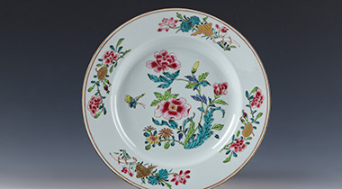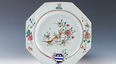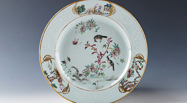 Introduction: The 18th century witnessed the heyday of maritime trade between China and the West. With the establishment of branches of the East India Company in European countries, the demand from European aristocrats for customized Chinese ceramics boomed. This contributed to China’s long-term foreign trade surplus, brought huge profits and drove the exchange of Eastern and Western culture during the period. The export of ceramics became a major channel through which Chinese culture reached the west during the Qing Dynasty. This customized famille-rose plate featured the coat of armorial of the family that ordered its production. Except for the upper and lower badges, the designs are of mountain rocks and flowers painted with traditional Chinese painting techniques. The two pheasants standing on the rocks are portrayed as if fighting and playing, making the picture lively and drawing the viewer into the scene.