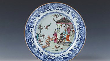 Introduction: This work is porcelain of the traditional Chinese style exported to Europe in the 18th century. It is an example of the exquisite products that were traded between the East and West through the Ancient Maritime Silk Route. The plate has a folded rim with a brown-glazed edge that is decorated with a blue and white pattern of flowers on twining branches. In the center of the plate is a painting of human figures in famille rose. After the famille rose pigment was applied, the porcelain was fired for a second time. The decoration on the rim of this plate was common in pieces exported from Jingdezhen kilns in the 18th century. The design is a result of the blending of Chinese and Western aesthetics through exchange and trade, which brought the Rococo style that prevailed in Europe at the time together with the pattern of flowers on twining branches that was popular during the Qianlong period. This blending generated a unique design style in exported porcelains of the period. The design in the center depicts part of the plot from The Story of the Western Wing, a romance written in the 13th century. It conveys young people’s desire for freedom in love during the time of China’s rigid feudal code of conduct, and also the hope for all lovers to be together. This plate is an important artifact not only for its artistic merit, but also for the insight it gives into ancient Chinese literature and culture.