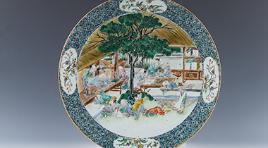 Introduction: This is a rare fine piece of Canton enamel porcelain made during the Xianfeng Reign of the Qing Dynasty. The Canton enamel technique was known for its bright and varied overglazed color pigments and was created mainly for the foreign market. It was very popular in the 18th century. The porcelain trade of the East India Company also greatly increased its production. This large porcelain plate is well preserved. The porcelain body is a fine white piece fired at high temperature in a kiln in Jingdezhen and the painting was completed by a workshop that specialized in overglazed decoration in Guangzhou. The folded rim features a patterned band and four roundels with flower and bird patterns. In the center of the well is a typical painting of folk life titled School life in the cottage. It captures the scene of a teacher taking a nap while naughty children are playing around him. The cottage and the parasol tree in the courtyard are drawn in dark colors to highlight the naughty children in bright colors.