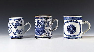 Introduction: These Qianlong period beer mugs are constructed in a straight and cylindrical shape. They are glazed in white with shallow, rounded feet, and dragon-shaped and intersected handles on one side. One of the mugs is pasted with a leaf design, which enhances connection with European aesthetics. The mugs are of typical European beer mug styles which were not introduced to China before the Qianlong period. Mugs such as these could be customized based on samples from Europe. The mugs are decorated with blue and white patterns. Despite the different designs depicted on each mug, the decorative styles of each are quite similar with flowers on both the upper and lower sides of the exterior. In the center of each side, delicate designs of flowers, landscapes, and pavilions are painted in panels. These mugs are typical of the beer mugs produced for the European market and each mug integrates the styles of traditional Chinese paintings and European aesthetics at that time, demonstrating the integration of Chinese and Western cultures in the 18th century through the Maritime Silk Route.
