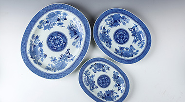 Introduction: This set of blue and white porcelain plates are exquisite pieces produced by private kilns for the foreign market during the Qianlong Reign of the Qing Dynasty. The three oval plates can be stacked and can be used in everyday life or for decoration. They have flared rims, flat bases, and shallow, arced sides. The rims are decorated with patterned bands. The interior walls are painted with various types of flowers, such as peonies, surrounding an auspicious pattern. The regularity of the shape and design of the patterns are complemented by the lustrous finish of the glaze and the depth of the blue color. All the patterns are painted with high-quality pigments of the time. These plates are typical Fitzhugh pattern porcelains. The Fitzhugh pattern was first designed in the 1760s by Thomas Fitzhugh, then director of Guangzhou administrative office of the East India Company. With a blend of Chinese and Western styles, this pattern was usually used in Armorial porcelain. The traditional Chinese patterns with auspicious meanings attracted consumers in Western countries, who were fascinated by the mysteries of Chinese culture, while the composition using Western design methods also catered to foreign markets. Therefore, the Fitzhugh design was greatly used on ornamental porcelain of various kinds for export to Europe and America until the 19th century.