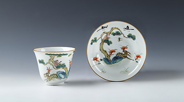 Introduction: This cup has a flared mouth, round foot and deep sides with white glaze. The rim is outlined in brown glaze. The bottom is inscribed in iron red with the reign mark “Made during the Xianfeng Reign.” The saucer has an open mouth, round foot, and brown-glazed rim. The cup and the saucer are both painted with designs of traditional Chinese patterns in famille rose, a technique known for its use of soft pigments (famille rose). In the painting, two magpies are flying and singing in the sky while a monkey is playing in a pine tree. Under the tree, a deer is holding a lucid ganoderma, a type of wild mushroom prized in Chinese medicine, in its mouth. Also present is a bee buzzing among the flowers. The delicate lines and famille-rose colors make the whole design lively and interesting. In Chinese culture, the green pine tree and lucid ganoderma are symbols of longevity. “Deer” (lu, 鹿), “bee” (feng, 蜂), and “monkey” (hou, 猴) share similar pronunciations with “path” (lu, 路), “confer” (feng, 封) and “nobility” (hou, 侯) in Chinese respectively. In this way, the whole piece implies a smooth path to being promoted and to be conferred with titles of nobility. With delicate painting, a clever design, good quality and auspicious meaning, this cup and saucer set is an exemplary work of private kilns during the Xianfeng Reign (1851-1861).