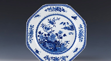 Introduction: This blue and white plate was made in Jingdezhen kilns for export during the Qianlong period and features an elegant and graceful style. The plate is octagonal in shape with a folded rim that is decorated with an orderly composition of flowers on cut stems and insects using underglaze blue. The detailed depiction of the subjects showcases the superb skills of the craftsmen of the Jingdezhen kilns and the high level of development of the ceramic manufacturing industry in Jingdezhen during this period. The design in the center of the plate is of peonies and rocks in the foreground, with mountains in the distance. The designs present a beautiful spring scene in the river regions of eastern China.