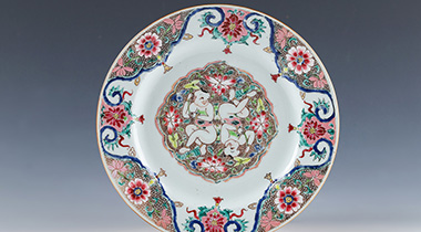 Introduction: This is a rare famille-rose plate in the Yongzheng period that features pure colors and a lustrous finish. On the rim there are pearl-like patterns and flowers on twining branches. The plate demonstrates the perfect fusion of traditional Chinese design style and the European Rococo style of the same period. The center of the plate is embellished with a design of two children holding lotus flowers, which is an auspicious expression of the desire to have more children. Worthy of note is the pattern of the two plump children, placed back to back with one inverted to make the picture seem complete from any perspective. This design was produced by a private kiln in Jingdezhen nearly 300 years ago, however, with the passage of time, it has become impossible to ascertain in which kiln it was made. This outstanding piece not only features vividly designed human figures but also demonstrates the rules of traditional Chinese design and the accumulated knowledge contained within it, as well as providing a lasting expression of ancient Chinese culture.