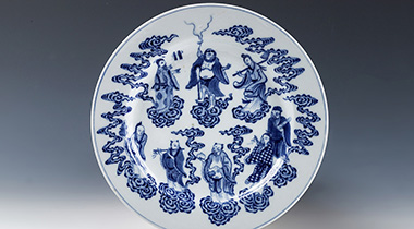 Introduction: This plate depicts the legendary story of the Eight Immortals Crossing the Sea, which was first recounted in a drama created in the Yuan Dynasty. In the story, eight Taoist Immortals had to travel across the sea to get back home after a feast. One of them suggested that instead of crossing the sea by boat, they could each do so using their own magical powers, to which the other seven agreed.