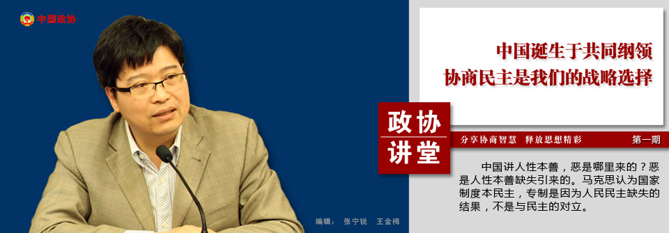 政治协商民主的源头是人民,这个源头就决定他的利益。首先谈国家利益,我们是社会主义国家,对马克思理论我们应该给予很好重新的认识。马克思在早期理论当中有很重要的命题,他说国家制度的本质是什么?是人自有的产物。如果我就按照西方的模式来走,人在社会中生活最大的目标是实现自我。实现自我最重要的东西,第一跟天地的共存,第二是跟他人的共存,大家和谐共存在一起就可以适应发展了。如何能够共存呢?这共存最大的地方在哪里呢?是你有利益推崇,我有利益推崇,最好是没有争斗,共存在一起,这就构成社会,最基本的是家庭社会,再往上扩大到一定程度就是马克思所说的生产发展。这一种自我来调控的共存,做不到就产生巨大的争斗,这时候人们就创造了一个非常有用的东西,这就是国家。