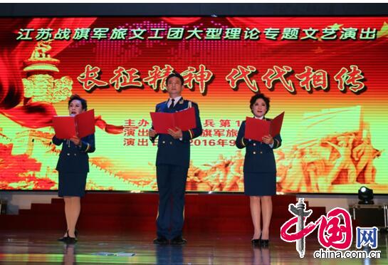 (中国网 江南2016年9月29日江苏南京消息) 2016年9月29日晚7点整,应中国人民解放军东部战区第十二集团军临汾旅的邀请,《江苏战旗军旅文工团》浩浩荡荡开进了第十二军集团军临汾旅,为纪念中国工农红军长征胜利八十周年,在祖国母亲67岁生日前夕给部队送来了由江苏省委宣传部干部沈向东同志创作并编导的《长征精神代代相传》大型理论专题歌舞。