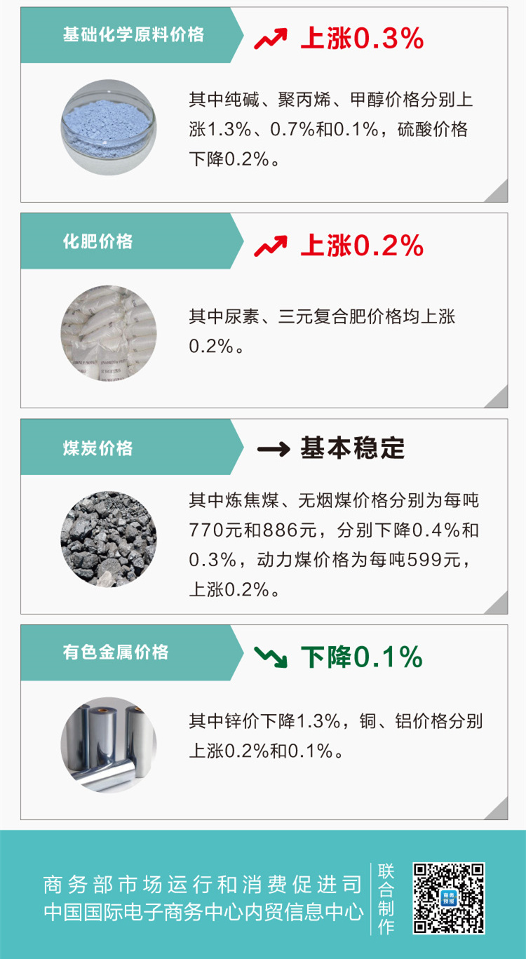 有色金属价格下降0.1%,其中锌价下降1.3%,铜、铝价格分别上涨0.2%和0.1%。
