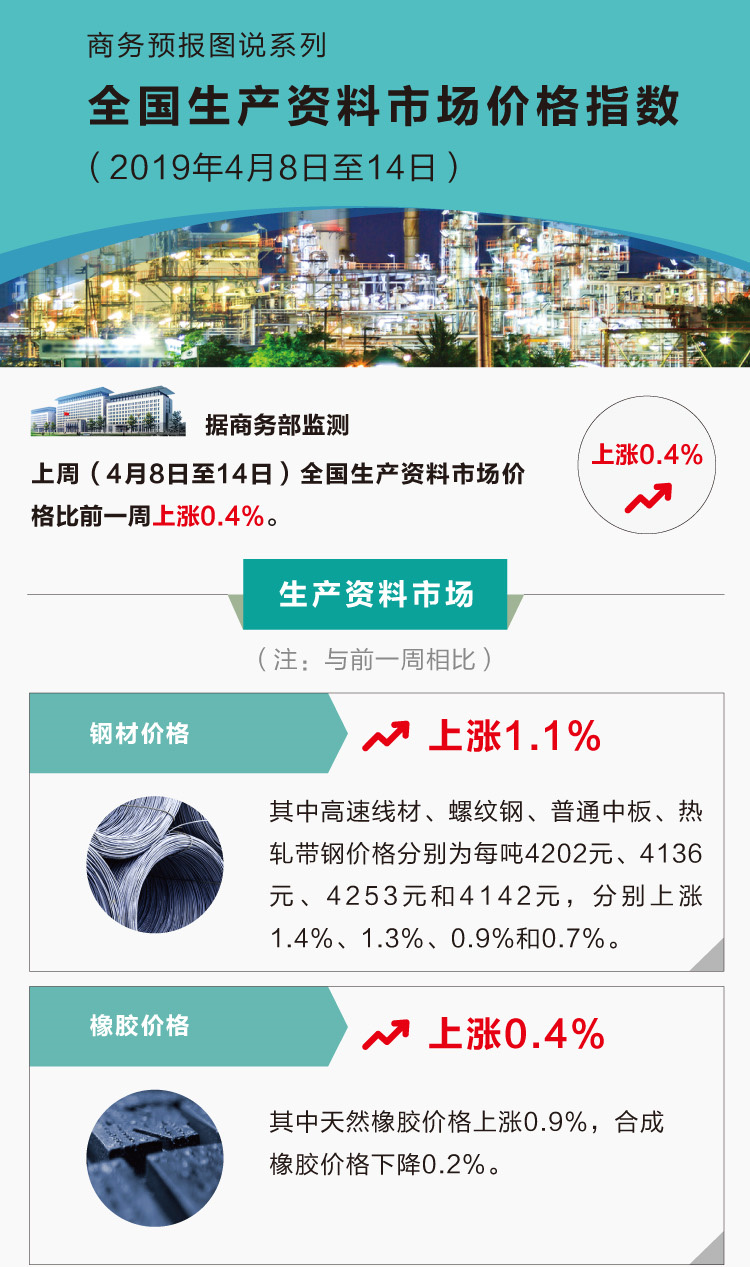 据商务部监测,上周(4月8日至14日)全国生产资料市场价格比前一周上涨0.4%。