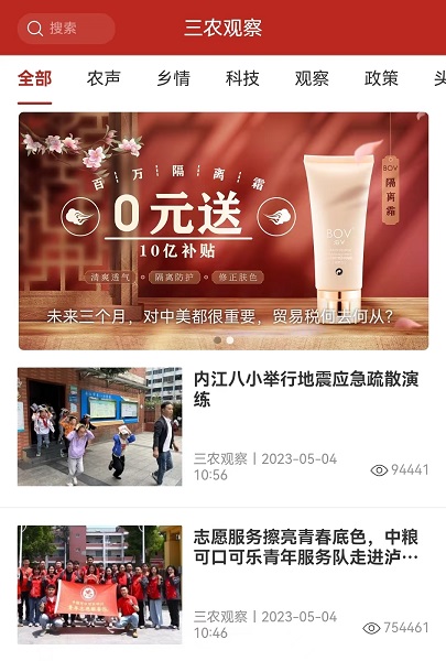 2023年5月4日,四川国视风采文化有限公司正式发布推出一款聚焦三农领域的专业信息发布平台——三农观察APP,这款产品从农业着手,为乡村服务,报道乡村振兴新气象,关注新时代农民生活。