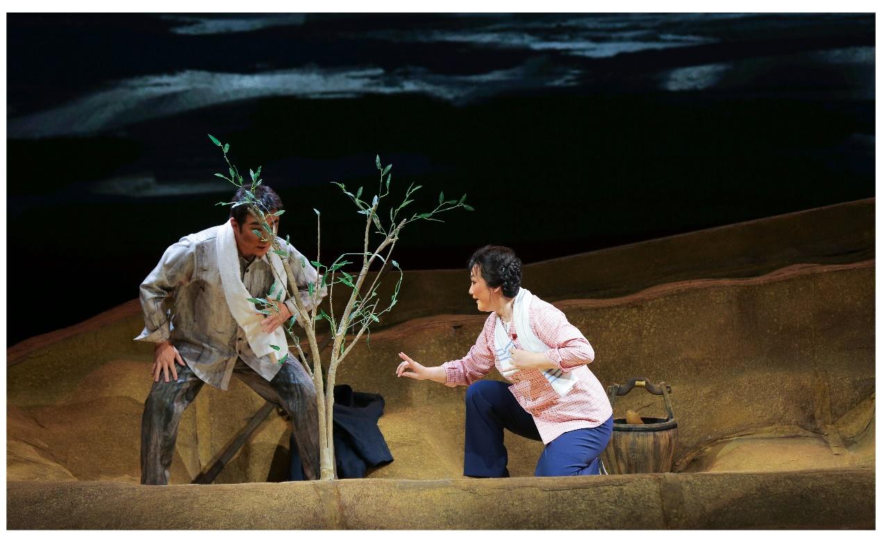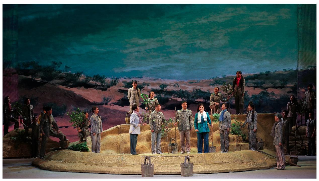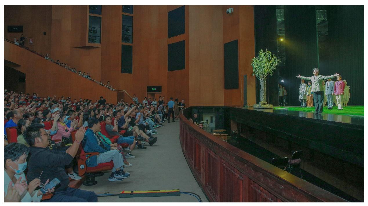 “大漠里的沙柳黄河里的浪,活就活出个人样样。”信天游的旋律在剧场回荡。当晚,1200余座位的深圳大剧院座无虚席。舞台上,何玉芳命运不屈的生命质感,治沙人不向命运低头的倔强和脊梁挺拔的人格力量。激起观众的情感共情,剧场掌声此起彼伏。李梅成功地塑造了何玉芳的舞台艺术形象,面对飞沙走石决不妥协,面对失去丈夫,儿子致残柔肠寸断,面对毁林诽谤义愤填膺,绵里藏针骨正而钢,表演细致入微,功底扎实。唱腔抒情时低吟润心,果敢时势如裂帛,直抵心灵,句句唱腔如生命的呐喊,唤起人们珍爱绿色,关注绿色发展的生态文明建设。观众为何玉芳用生命书写绿洲丰碑的人生际遇而感动。