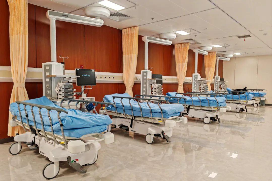 急诊留观区、急诊病房、急诊lCU设置床位60余张。配备有呼吸机、心电监护仪、心脏除颤器、体外循环机等高端先进的抢救设备。完善的院前急救、院内救治、重症监护分区设置,可为各类急诊患者提供全方位健康守护。