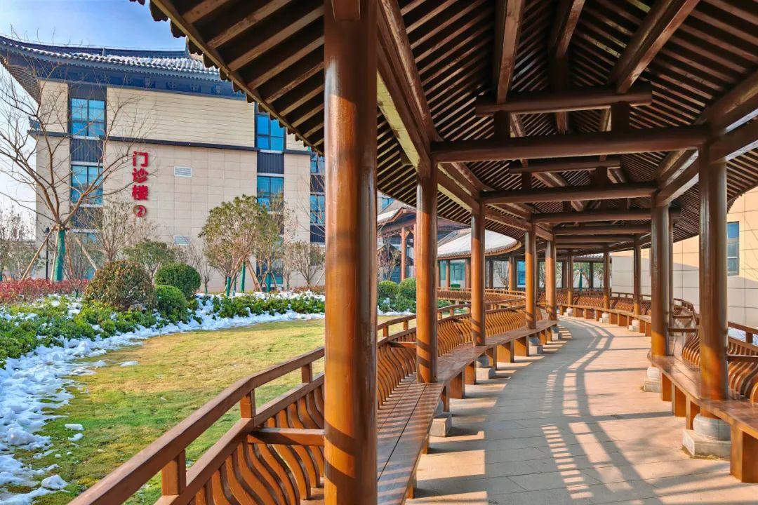 走出急救中心,有风雨连廊与毗邻的门诊楼相连,方便通行,古色古香的设计神韵时刻传递着传承使命的价值、守护生命的稳重。
