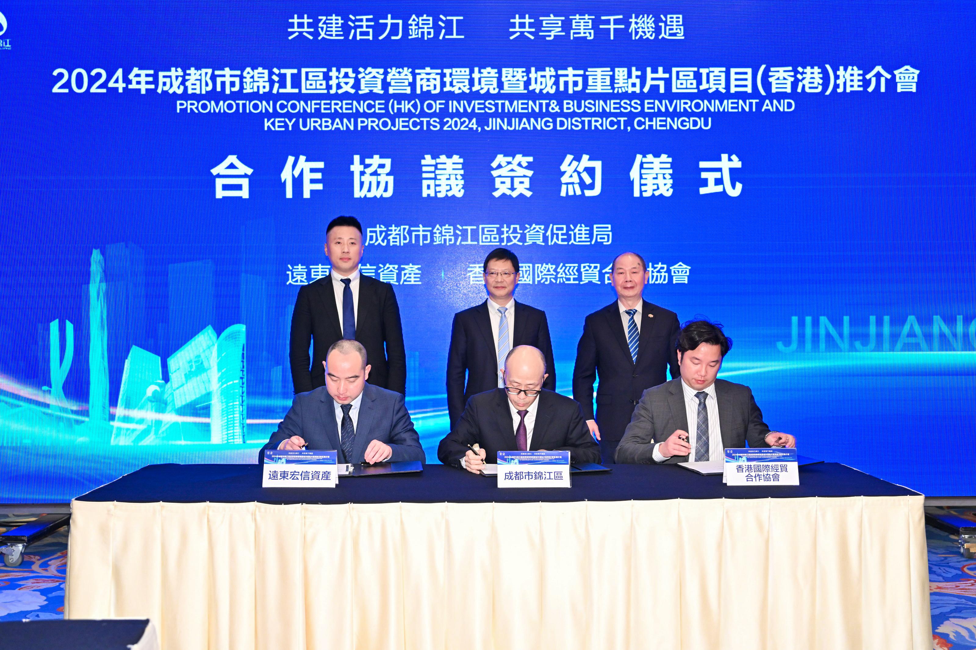 会上,锦江区政府与香港国际经贸合作协会、远东宏信有限公司在推介会上签订合作协议,将在白鹭湾科技生态园、交子金融商圈锦江片区等重点片区与企业开展深层次合作,进一步拓展项目资源,推动产业集群发展。
