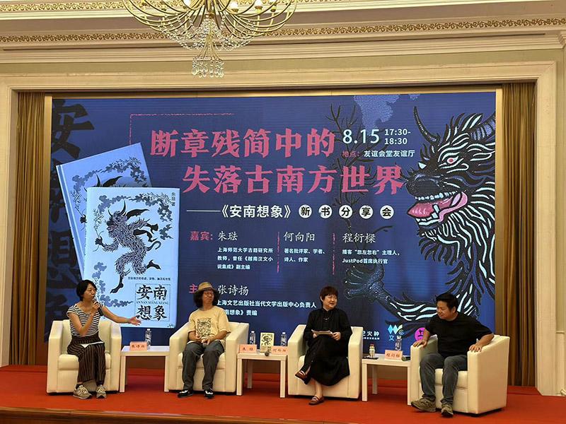 8月15日下午,断章残简中失落的古南方世界——《安南想象》新书分享会在上海展览中心友谊会堂友谊厅举行。本书作者朱琺、中国作协创研部主任何向阳、“忽左忽右”Justpod首席执行官程衍樑共同为读者带来一场奇幻的南方之旅。