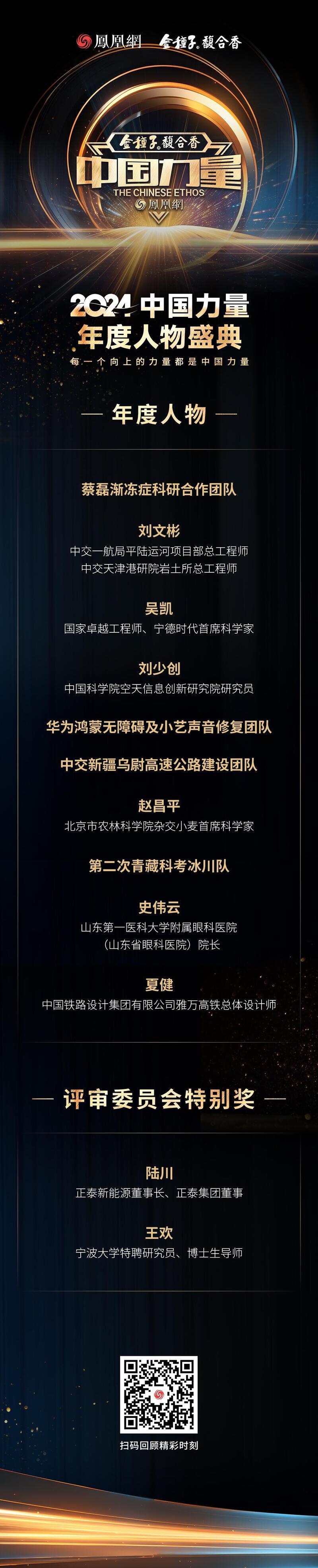 历经专家评审团的推荐、评审与数百万大众投票,“2024中国力量年度人物”现场揭晓:蔡磊渐冻症科研合作团队,中交一航局平陆运河项目部总工程师、中交天津港研院岩土所总工程师刘文彬,国家卓越工程师、宁德时代首席科学家吴凯,中国科学院空天信息创新研究院研究员刘少创,华为鸿蒙无障碍及小艺声音修复团队,中交新疆乌尉高速公路建设团队,北京市农林科学院杂交小麦首席科学家赵昌平,第二次青藏科考冰川队,山东第一医科大学附属眼科医院、山东省眼科医院院长史伟云,中国铁路设计集团有限公司雅万高铁总体设计师夏健获颁2024中国力量年度人物。正泰新能源董事长、正泰集团董事陆川,宁波大学特聘研究员、博士生导师王欢获颁评审委员会特别奖。