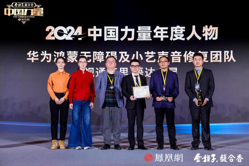 华为鸿蒙无障碍及小艺声音修复团队当选2024中国力量年度人物,团队代表华为TECH4ALL数字包容办公室高级营销经理沈兴文、小艺声音修复项目经理赵伟、语音技术专家孟廷登台领奖。