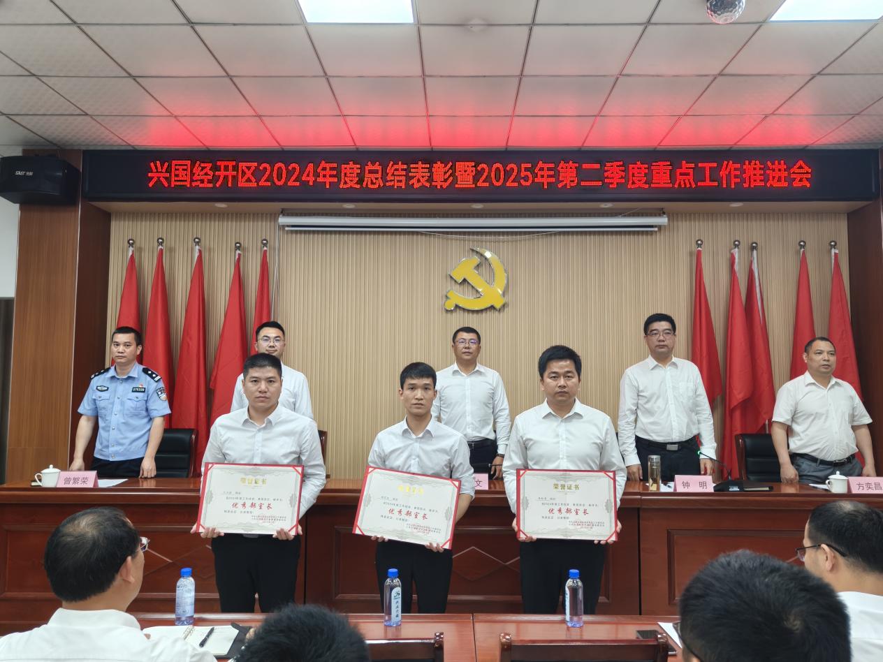 会议宣读了《关于通报表扬兴国经济开发区2024年度优秀部室和先进个人的决定》,党工委委员为获奖部室和个人颁发奖牌和证书。