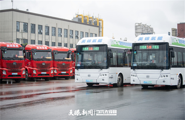 现场,全国首台商用氢能机车头投入试运行。同时,100辆49吨级氢能重卡及4辆8.6米氢燃料电池公交车正式投运。