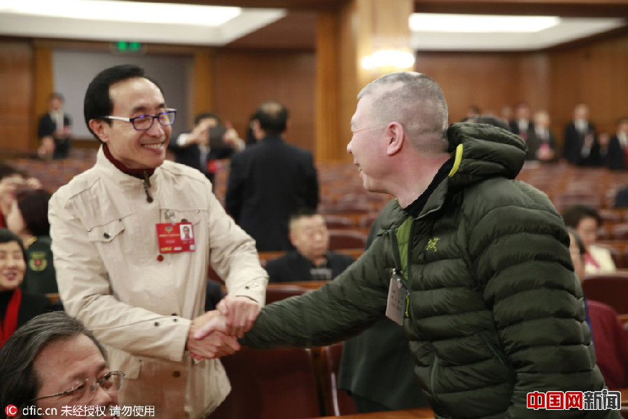 2016年3月3日,北京,全国政协十二届四次会议定于3日下午3时在人民大会堂开幕,对中外记者开放。中国正式进入“两会时间”。今年是“十三五”规划开局之年,透过全国两会,未来两周,“中国议题”将引来全球关注。图为会场内的委员,巩汉林和冯小刚握手。东方IC