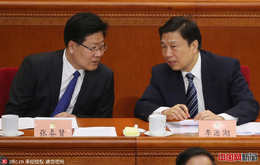 2016年3月3日,北京,全国政协十二届四次会议定于3日下午3时在人民大会堂开幕,对中外记者开放。中国正式进入“两会时间”。今年是“十三五”规划开局之年,透过全国两会,未来两周,“中国议题”将引来全球关注。据悉,本次大会的主要议程是听取和审议全国政协常委会工作报告和提案工作情况的报告,审议并通过政协十二届四次会议政治决议等决议和报告;列席十二届全国人大四次会议,听取并讨论政府工作报告、最高人民法院工作报告、最高人民检察院工作报告及其他报告。张春贤、李源潮会场交谈。WU HONG/东方IC